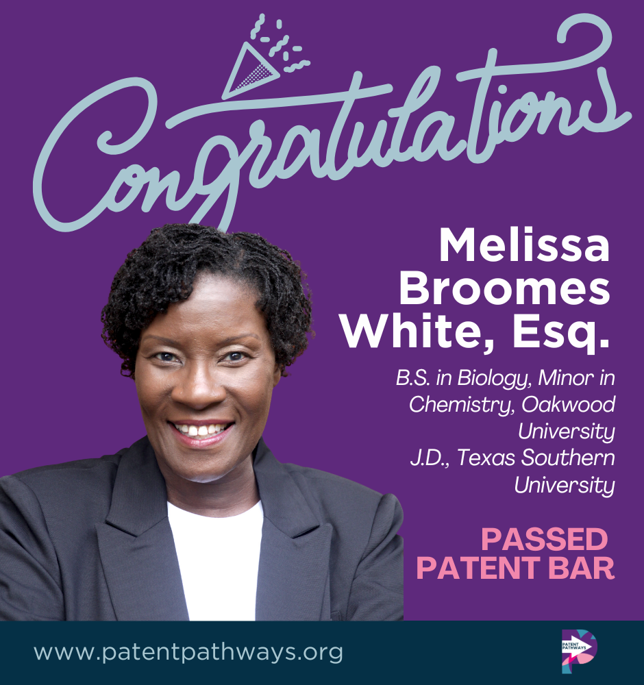 We are thrilled to celebrate a major milestone for one of our outstanding Patent Pathways® alumni: Melissa B. White has officially passed the patent bar and is now a Registered Patent Attorney with the United States Patent and Trademark Office (USPTO)!